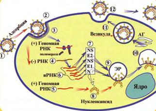 Геномная РНК связывается с рибосомами и служит в качестве иРНК при синтезе РНК-зависимой РНК-полимеразы (рис. 42, 3), которая затем считывает геномную РНК, синтезируя минус-нить полной длины (рис. 42, 4). При считывании минус-нити образуется новая геномная плюс-РНК (рис. 42, 5) и набор из 5-7 субгеномных иРНК (рис. 42, 6). При трансляции каждой субгеномной иРНК образуется один белок (рис. 42, 7). Белок N связывается в цитоплазме с геномной РНК, в результате чего образуется спиральный нуклеокапсид (рис. 42, 8). Гликопротеины Е1, Е2 переносятся (рис. 42, 9, 10) в эндоплазматический ретикулум и аппарат Гольджи. Нуклеокапсид почкуется через мембраны внутрь шероховатого эндоплазматического ретикулума, содержащего вирусные гликопротеины Е1, Е2 (рис. 42, 10). Вирионы транспортируются в везикулах к клеточной мембране (рис. 42, 11) и выходят из клетки путем экзоцитоза (рис. 42, 12).