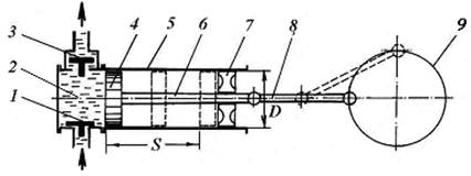 1 – всмоктувальний клапан; 2 – робоча камера; 3 - нагнітальний клапан; 4 – поршень; 5 – циліндр; 6 – шток; 7 - крейцкопф; 8 – шатун; 9 – маховик;