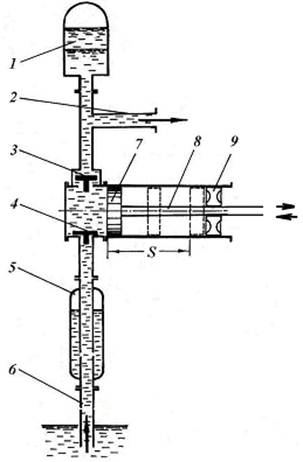| Рис. 52. Поршневий насос з повітряними ковпаками: 1, 5 – повітряні ковпаки; 2, 6 – нагнітальний і всмоктувальний трубопроводи; 3, 4 – нагнітальний і всмоктувальний клапани; 7 – поршень; 8 – шток; 9 - крейцкопф. |