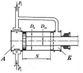 Диференціальні поршневі насоси (рис. 54) відрізняються від насосів простої дії більш рівномірною подачею, оскільки повна подача за подвійний хід розподіляється рівномірно між ходами. У цих насосах при ході поршня або плунжера вправо утворюється розрідження в камері А над усмоктувальним клапаном, і вона заповнюється рідиною. Одночасно об’єм рідини (який дорівнює об’єму поршня або плунжера, що виходить з внутрішньої порожнини насосу) витискується з напірної камери Б при закритому нагнітальному клапані. При зворотному ході (вліво) усмоктувальний клапан закривається, і об’єм рідини, що поступив до цього у камеру А, витискується з неї через нагнітальний клапан.