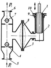 | Рис. 55. Схема горизонтального плунжерного насосу простої дії: 1 - плунжер (скалка); 2 - сальник; 3 - циліндр; 4 - всмоктувальний клапан; 5 - нагнітальний клапан. | Рис. 56. Діафрагмовий насос: 1 – плунжер; 2 – циліндр; 3 – корпус; 4, 7 – всмоктувальний і нагнітальний клапани; 5, 6 – всмоктувальний і нагнітальний патрубки; 8 – діафрагма; 9 – сальник; 10 – грунбукса. |