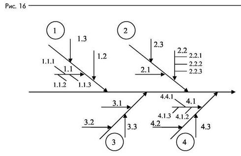 Диаграмма «причины-результаты» или график Исикавы «рыбья кость» очевидно названы так потому, что Япония - это острова, а рыба - основной продукт питания. Рыбу в Японии видят все и ежедневно, и диаграмма Исикавы для анализа причин, вызывающих увеличение брака, позволяет наглядно охарактеризовать условия и факторы (главные движущие силы совершающегося процесса), влияющие на неупорядоченность системы управления качеством (рис. 16). Диаграмма не только показывает причинно-следственные связи, но и вектор (направление), в котором следует предпринимать действие для устранения ошибок и недостатков в работе, вызывающих брак.