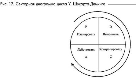 В секторной диаграмме (рис. 17), отражающей цикл РDСА ((Plan-Do-Cheek-Art), известной также как цикл Шухарта-Деминга использован круг, отображающий бесконечность процесса усовершенствования, его движение и поэтапность наступления циклов, их смены, как во временах года.