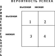 В матрице возможностей в левом верхнем квадранте (1) представлены наиболее перспективные рыночные возможности компании. Возможности, представленные в нижнем правом квадранте (4), незначительны и даже не рассматриваются. Возможности, представленные в верхнем правом (2) и нижнем левом (3) квадрантах, должны быть тщательно проанализированы на случай, если через какое-то время их привлекательность и вероятность успеха увеличатся.