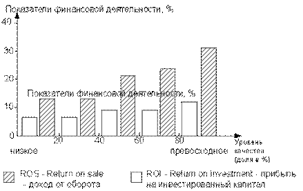 На рис. 2.4 показаны уровни полученных доходов от сбыта (ROS, Return on Sale – доход от оборота) и прибыль на инвестиции (ROI, Return on Investment – прибыль на инвестированный капитал). Эти показатели выше у производителей продукции более высокого качества.