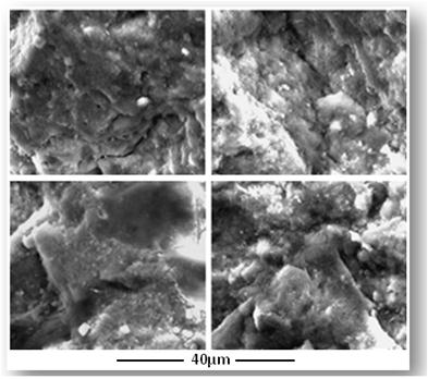 «Исследования процессов гидратации цементов под микроскопом показали, что взаимодействие цементных зерен с водой происходит без распада цементных зерен на мелкие частицы…» (А.Е.Шейкин), т.е. это взаимодействие осуществляется при отсутствии «адсорбционного диспергирования» частиц вяжущего, размеры которых неизменны на всем протяжении твердения цементного композита и этот момент однозначно фиксируется экспериментальным путем. На рис.2.4 представлено строение цементного камня в трехмесячном возрасте; какие же изменения произошли спустя 31 год его выдерживания в обычных условиях (рис.2.5)? Те же огромные негидратированные внутренние массивы клинкерных зерен, поверхностные гидратные накопления (обведены на рисунках), толщиной, оцениваемой долями микрона.