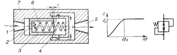 При значении перепада давления Δ P < Δ P0 расход жидкости через ограничитель расхода будет зависеть от ΔP. При Δ P > Δ P0 расход жидкости станет предельным и равным Q0 (см.рис.6.8, б).