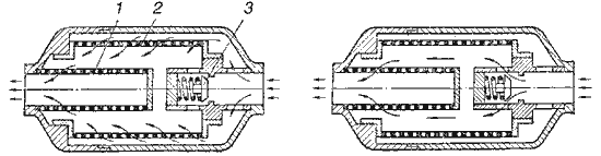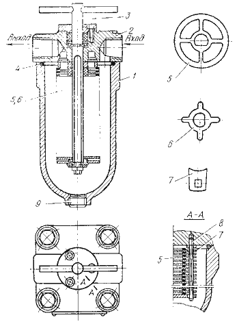 | Рис.7.9. Войлочный фильтр типа Г43: 1 - корпус; 2 - крышка; 3 - перфорированная труба; 4 - фильтрующие элементы | Рис.7.10. Магнитный фильтр типа С43-3: 1 - пробка; 2 - латунная шайба; 3 - корпус; 4 - шайба; 5 - прокладка; 6 - уплотнение; 7 - латунная труба; 8 - крышка; 9 - магниты | |