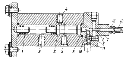 9, 13 - пружины; 10 - шток; 11 - упор; 12 - золотник;