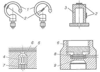 а - с трубкой Бурдона; б - тонкостенный цилиндрический датчик с наклеенными тензодатчиками; в - с манганиновой проволокой; г - пьезоэлектрический; 1 - трубка Бурдона; 2 - тензодатчики;