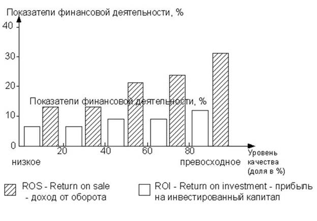 Для того, чтобы подтвердить актуальность проблемы роста заинтересованности предприятий в выпуске продукции оптимального уровня качества можно привести следующие данные: на рисунке показаны уровни полученных доходов от сбыта (ROS, Return on Sale – доход от оборота) и прибыль на инвестиции (ROI, Return on Investment – прибыль на инвестированный капитал). Эти показатели выше у производителей продукции более высокого качества.