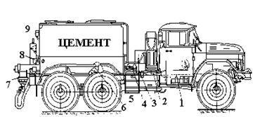 1 – автошасси ЗИЛ-131А; 2 – коробка отбора мощности; 3 – карданный вал; 4 – редуктор; 5 – бункер; 6 – винтовой конвейер; 7 – гидросмесительное устройство; 8 – щиток приборов; 9 – пневматический вибратор.