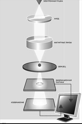 Пучок электронов проходит через исследуемый препарат и его изображение проецируется на люминесцентный экран. Источником электронов является электронная пушка (вольфрамовая нить), нагреваемая электротоком. Электроны ускоряются и направляются вниз по колонке, проходя через несколько магнитных линз (конденсорная, объективная, проекционная). На экране возникает видимое изображение объекта, которое можно сфотографировать или просматривать на экране монитора (рис.7).