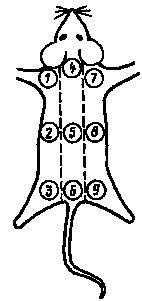 Метка белых мышей, белых крыс может быть проведена ампутацией отдельных пальцев на передних или задних конечностях, каждый из которых соответствует тому или другому порядковому номеру: на передних лапах – единицам, на задних – десяткам. Однако чаще пользуются методом нанесения цветных пятен на непигментированную шерсть. Насыщенный раствор пикриновой кислоты лучше других красителей (растворов фуксина, бриллиантовой зелени) удерживается на шерсти и коже животных. Цветные метки ставятся в местах, соответствующих определенному порядковому номеру животного. Так, если тело животного мысленно разделить на три продольные части (левый бок, спина, правый бок), то нанесение цветных пятен начинают с левого верхнего угла, т. е. лопатки, и это будет соответствовать 1 (рис. 8). Тогда, двигаясь назад, левый бок соответствует 2, а левое бедро – 3, далее затылок – 4, спина – 5, область репицы – 6, правое плечо – 7, правый бок – 8, правое бедро – 9. Используя два цвета красителей, можно дать обозначения одним из них – единиц, другим – десятков.