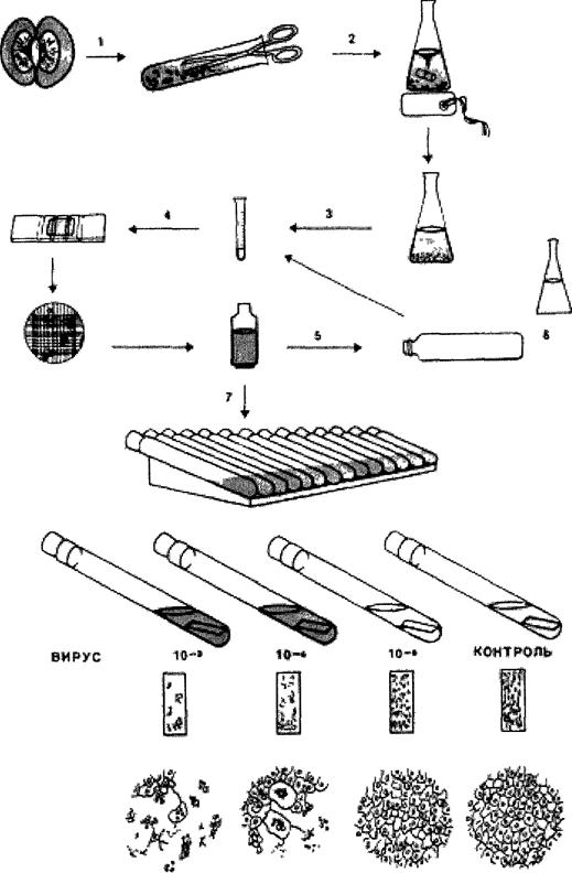 Рисунок 28. Последовательность приготовления почечной культуры клеток. 1 – измельчение коркового слоя; 2 – трипсинизация; 3 – осаждение диспергированных клеток центрифугированием, 4 – подсчет живых клеток в гемоцитометре; 5 – диспергирование клеток в среде выращивания, во флаконах Ру; 6 – снятие первичного монослоя культуры клеток с помощью трипсиноверсеновой смеси, процедура повторного осаждения и подсчета клеток; 7 – суспендирование клеток в среде роста, розлив по пробиркам и инкубация их в стационарных условиях до заражения вирусом