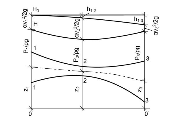 В общем случае потери напора могут происходить за счет уменьшения всех трех величин. Если же трубы постоянного диаметра, следовательно, скорость в них постоянна, потери происходят за счет уменьшения пьезометрического напора