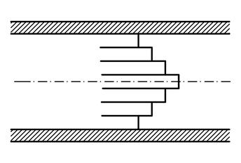 Ламинарное движение является упорядоченным слоистым движением. Так как перемещение жидкости происходит в осевом направлении, а поперечное перемещение отсутствует, то схематично ламинарный поток может представить в виде бесконечно большого числа бесконечно тонких концентрически расположенных цилиндрических слоев, параллельных оси трубопровода и движущихся один внутри другого с различными скоростями, увеличивающимися от стенок к оси.