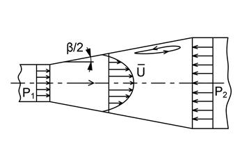 При движении с уменьшением скорости на расширяющихся участках потока (диффузорах), согласно уравнению Бернулли, происходит увеличение давления (рисунок 2). Таким образом, движение на расширении происходит от сечения с меньшим давлением к сечению с большим давлением. Это противодавление затрудняет поступательное движение жидкости, особенно у стенок, где скорости имеют небольшие значения. При углах расширения β>8-10° частицы у стенок могут остановиться и даже начать двигаться назад, что приводит к отрыву основного потока от стенки и образованию водоворотных зон. Обычно отрыв бывает несимметричным и происходит у одной из стенок, а транзитный поток смещается к другой стенке. Во избежание больших потерь; напора рекомендуется выполнять расширения трубы с углом β< 8°.