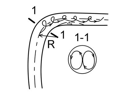 При плавном повороте трубы или канала возникают центробежные силы, которые увеличивают давление у вогнутой стенки и уменьшают у выпуклой (рис. 4). В результате создаются условия для движения частиц жидкости в поперечном направлении от области большего давления к области меньшего давления. Такое явление называется поперечной циркуляцией, в круглых трубах оно имеет вид, показанный на рис. После поворота возникает вращательно поступательное движение, которое затухает на некотором расстоянии.