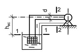 Принимаем расчетные сечения на поверхности воды в резервуаре 1-1, перед входом в насос 2-2 (рис.7.1). Плоскость сравнения совместим с сечением 1-1. На поверхности воды в резервуаре давление равно атмосферному p1=pа, а перед входом в насос давление определяется величиной вакуума. Кроме того, z1 =0 и υ 1=0, так как размер резервуара больше сечения трубы, z2=hвс. С учетом этого уравнение Бернулли примет вид