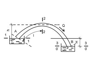 Сифонным называется трубопровод, работающий в условиях вакуума (рис.7.3). Часть такого трубопровода находится выше уровня воды в резервуарах А и В. Особенностью расчета является необходимость проверки величины вакуума в наивысшей точке сечения. Проведем плоскость сравнения по поверхности резервуара В, z 1=0; p 1= p атм.; υ 1=0; z2=h, тогда, уравнение Бернулли для сечений 1-1 и 2-2