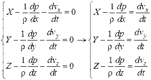 Полное ускорение в направлении оси координат складывается из ускорений. Вызванных массовыми силами и силами давления.