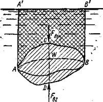 Пусть в жидкость погружено тело произвольной формы объемом V (рис. 1.16). Спроектируем его на свободную поверхность жидкости и проведем проектирующую цилиндрическую поверхность, которая касается поверхности тела по замкнутой кривой. Эта кривая отделяет верхнюю часть поверхности тела АСВ от нижней ее части ADB. Вертикальная составляющая Fsi силы избыточного давления жидкости на верхнюю часть поверхности тела направлена вниз и равна весу жидкости в объеме АА'В'ВСА. Вертикальная составляющая FBa силы давления жидкости на нижнюю часть поверхности тела направлена вверх и равна весу жидкости в объеме AA'B'BDA. Отсюда следует, что вертикальная равнодействующая сил давления жидкости на тело будет направлена вверх и равна весу жидкости в объеме, равном разности указанных двух объемов, т. е.
