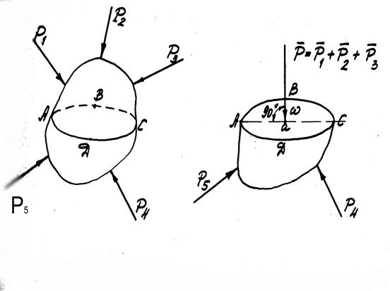 Под влиянием воздействий этих сил в жидкости возникают механические напряжения. Чтобы выяснить характер этих напряжений и выявить законы их изменения рассмотрим некоторый объем жидкости (рис. 1), находящийся в равновесии под действием сил Р1, Р2 и т.д. Если рассечь мысленно этот объем произвольно выбранной плоскостью АВСД и отбросить его верхнюю часть, то для сохранения равновесия его нижней части необходимо к плоскости АВСД приложить силы, эквивалентные действию верхней отброшенной части на нижнюю.