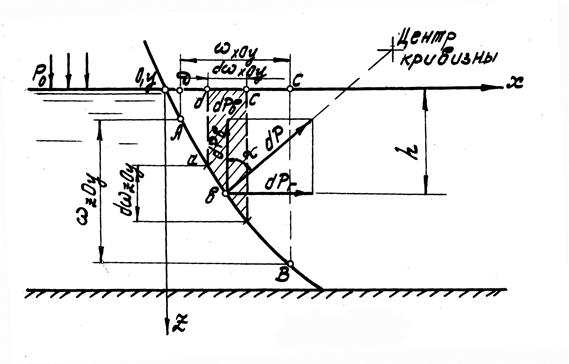 Эту эпюру можно рассматривать как состоящую из двух частей: эпюры АВСД, изобретающей избыточное (весовое) давление на площадь проекции поверхности АВ на плоскость XOY, и эпюры ДСС1Д1, характеризующей внешнее давление р0. Сила давления РВ, равная численно объему АВС1Д1, проходит через центр тяжести этого объема.