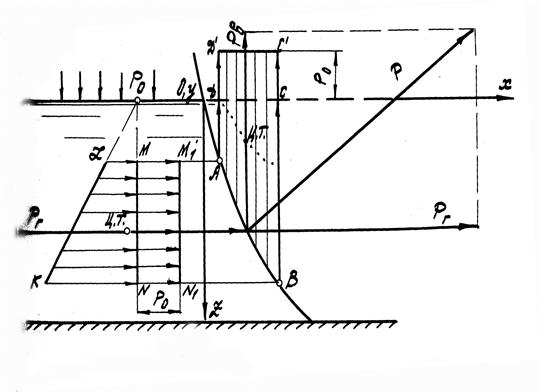Эпюра горизонтальной составляющей абсолютного гидростатического давления на криволинейную поверхность АВ строится так же, как и для плоских стенок. В данном случае она представляется фигурой KZMN, которую можно рассматривать как состоящую из двух частей: эпюры KZM1N1, изображающей избыточное (весовое) давление жидкости, и эпюры MNN1M1, характеризующей внешнее давление р0. Сила давления РT, равная объему эпюры KZM1N1, проходит через центр тяжести этого объема.