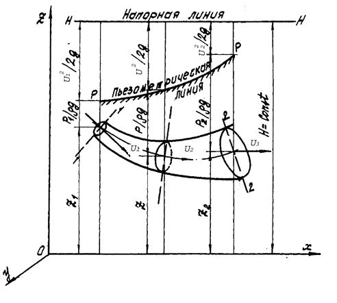 Слагаемые уравнения Бернулли можно изобразить графически, если отнести струйку к системе координат XYZ (рис. 3) и откладывать от горизонтальной плоскости XOY для ряда сечений геометрические напоры Z, пьезометрические −