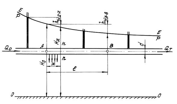 Пусть на участке А–В (рис.10) через продольную щель трубопровода происходит непрерывный сброс жидкости так, что расход