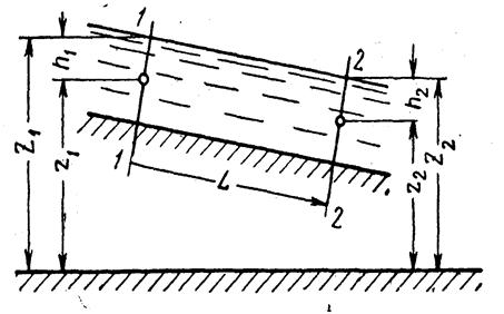 Рассмотрим сначала движение в открытых каналах. Составим уравнение Бернулли для сечений 1 – 1 и 2 – 2 открытого потока (рис.1) при равномерном движении. В общем виде это уравнение имеет вид