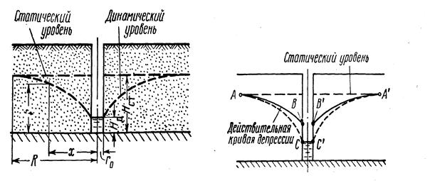 В качестве примера безнапорного движения грунтовых вод paссмотрим откачку воды из колодца или скважины, заложенной в водоносном пласте с горизонтальным непроницаемым подстилающим слоем. До начала откачки грунтовые воды в пласте находятся в покое и поверхность их горизонтальна. Если откачивать воду из колодца, в водоносном слое начнется движение грунтовых вод к колодцу.