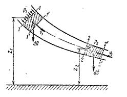 Применим к массе жидкости в объеме участка струйки теорему механики об изменении кинетической энергии суть, которой в том, что работа сил, приложенных к телу, равна приращению кинетической энергии этого тела. Такими силами в данном случае являются силы давления, действующие нормально к поверхности рассматриваемого участка струйки, и сила тяжести.