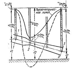 Это положение иллюстрируется графиком (рис.4.2), где показано изменение всех трех высот вдоль струйки. Линия изменения пьезометрических высот называется пьезометрической линией.