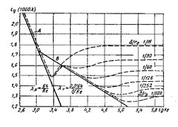 2. Критическое число Re от шероховатости практически не зависит; штриховые кривые отклоняются от прямой А приблизительно при одном и том же Reкр (