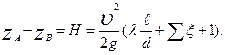 . Первое слагаемое так же, как и в предыдущем случае, учитывает потери напора на протяжении трубопровода, начиная от выхода из резервуара А в трубу (точка а) и до конца трубы (точка б), за исключением потерь напора на выход в резервуаре В, которые оценены вторым слагаемым.