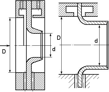 Основное уравнение расхода (2.3) справедливо и для сопел. Расходомерное сопло (рис. 2.3) представляет собой устройство с круглым отверстием, имеющим плавно сужающуюся часть на входе и цилиндрическую часть на выходе.