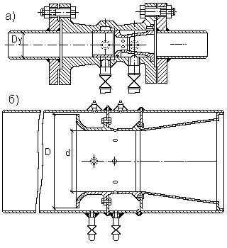 Трубы Вентури были предложены ранее других сужающих устройств. В зависимости от размеров диффузора трубы Вентури бывают короткими и длинными. Различают три конструктивных исполнения труб Вентури: А - стальные сварные из листового материала на Dу = 200... 1400 мм, Ру до 16 МПа; Б - с литыми необработанными входными частями, обработанной горловиной на Dу = 100... 800 мм Ру до 25 МПа; В - с обработанными входным патрубком, конусом и горловиной на Dу = 50... 250 мм, Ру до 4 МПа.