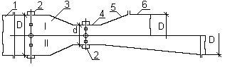Стандартные трубы Вентури (рис. 2.5) состоят из следующих основных частей: входного цилиндра, сужающего конуса, горловины, расширяющегося конуса и выходного цилиндра. Все части собираются путем сварки. Отбор давления осуществляется из усредняющих кольцевых камер. В нижней части кольцевых камер устанавливаются пробковые краны для спуска жидкости.