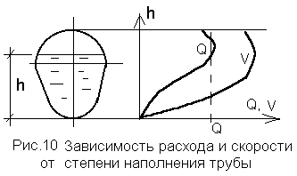 Подсчетами по формуле Шези доказано, что глубина, отвечающая максимальной скорости лежит в пределах h1 = (0,8 – 0,85) D.