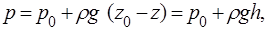 где р 0 — давление в точках горизонтальной плоскости с координатой z 0 (в качестве такой плоскости чаще всего выбирается свободная поверхность жидкости); z — координата точки, в которой определяется давление р; h = z 0 — z — глубина погружения рассматриваемой точки по отношению к плоскости с координатой z 0; g — ускорение свободного падения (рис. 1.1).