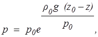 где р0 , ρ0 — соответственно абсолютное давление и плотность газа в точках горизонтальной плоскости с координатой z0. Из формулы (1.31) можно найти высоту