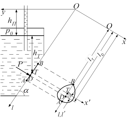 где lD и lT — соответственно расстояния до центра давления и центра тяжести, отсчитываемые вдоль плоскости стенки от линии пересечения ее с пьезометрической плоскостью (см. рис. 1.2); J — момент инерции площади смоченной части стенки относительно горизонтальной оси, проходящей через ее центр тяжести.