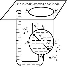 На примере рис. 1.3 видно, что давление в любой точке криволинейных поверхностей, как ABC, так и ADC, избыточное (пьезометрическая плоскость лежит выше этих поверхностей). Следовательно, элементарные силы давления dP, действующие по нормали к касательной в любой точке этих поверхностей, направлены наружу. Разложение их на составляющие показывает, что вертикальная составляющая силы