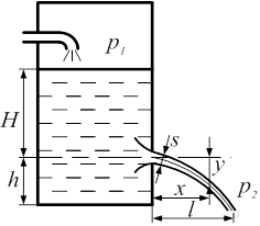 Рис. 8.1. Схема истечения жидкости из резервуара через малое отверстие в тонкой стенке