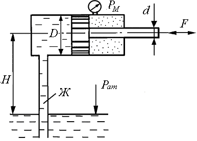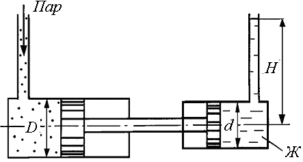 2. Паровой прямодействующий насос подает жидкость Ж на высоту Н (рис. 1.2). Каково абсолютное давление пара, если диаметр парового цилиндра D, а насосного цилиндра d? Потерями на трение пренебречь.