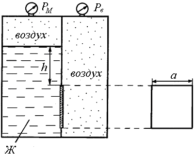 4. Замкнутый резервуар разделен на две части плоской перегородкой, имеющей квадратное отверстие со стороной а, закрытое крышкой (рис. 1.4). Давление над жидкостью Ж в левой части резервуара определяется показаниями манометра PM, давление воздуха в правой части – показаниями мановакуумметра. Определить величину и точку приложения результирующей силы давления на крышку.