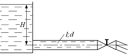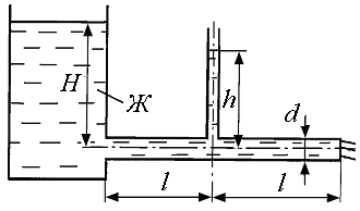 7. При истечении жидкости из резервуара в атмосферу по горизонтальной трубе диаметра d и длиной 2l уровень в пьезометре, установленном посередине длины трубы, равен h (рис. 1.7). Определить расход Q и коэффициент гидравлического трения трубы l, если статический напор в баке постоянен и равен Н. Построить пьезометрическую и напорную линии. Сопротивлением входа в трубу пренебречь.